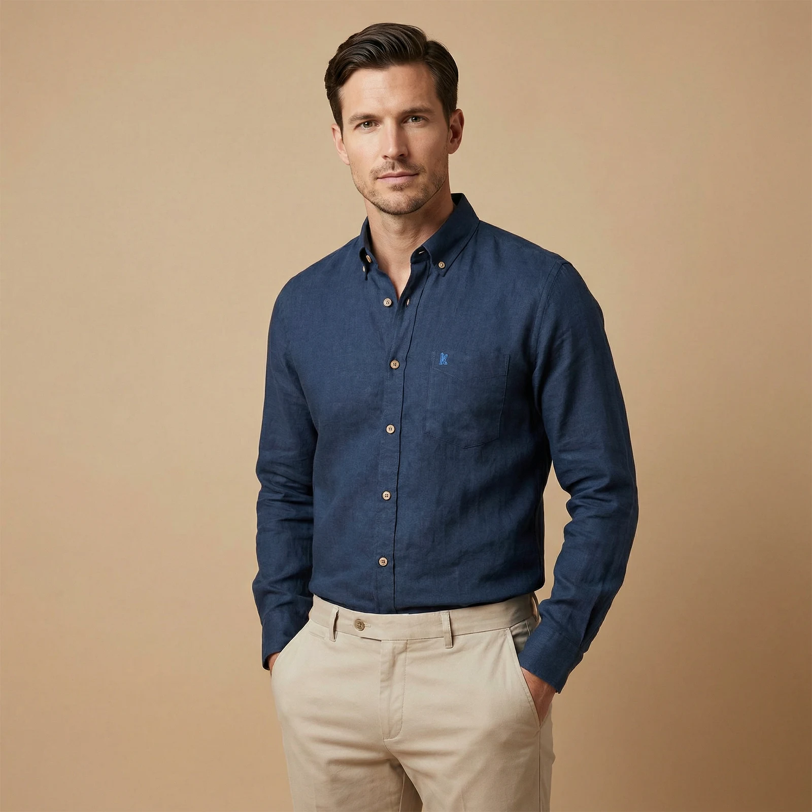 El cuello abotonado aporta estructura y versatilidad, ideal tanto para un look casual refinado como para ocasiones más formales. El bolsillo frontal con bordado sutil añade identidad sin romper la estética limpia de la prenda.